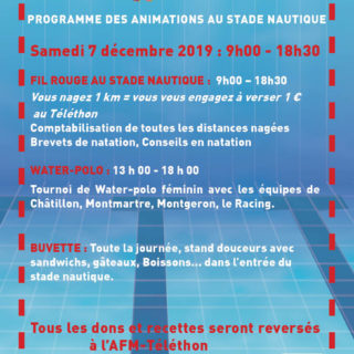 Téléthon, samedi 7 décembre au stade nautique de 9 h à 18h30. Au programme : fil rouge, tournoi féminin de water-polo, buvette… Nous avons besoin de vous pour faire de cette journée une réussite… Fil rouge : vous vous fixez...