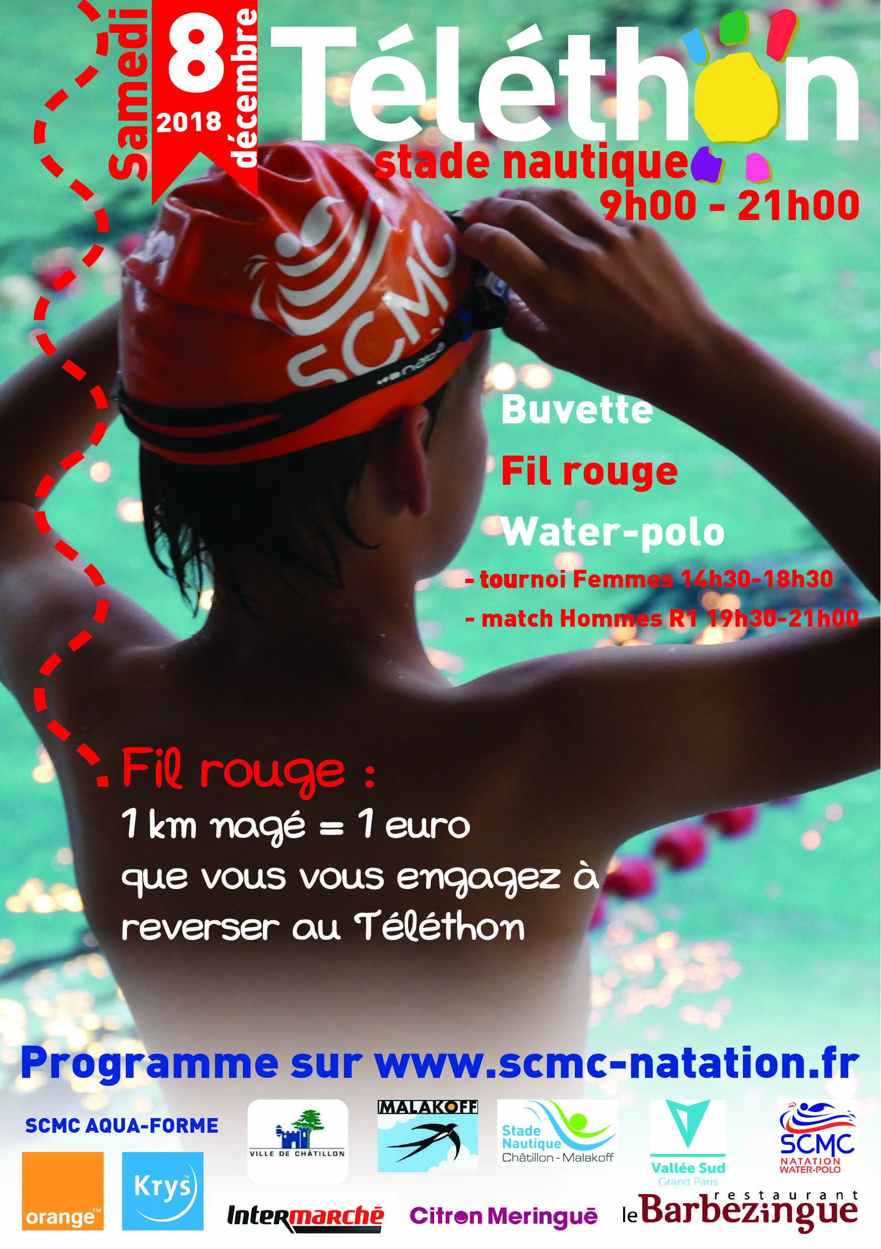 Programme du Téléthon, Samedi 8 décembre 2018 : 9h00 – 21h00 FIL ROUGE AU STADE NAUTIQUE : 9h00 – 18h30 Vous nagez 1 km = vous vous engagez à verser 1 € au Téléthon Comptabilisation de toutes les distances nagées...