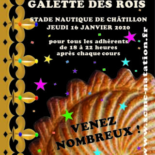 Venez nombreux déguster une galette après vos cours, jeudi 16 janvier 2020 de 18 à 22 heures au Stade nautique… Bonne année à tous !