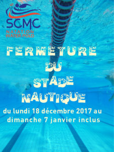 FERMETURE DU STADE NAUTIQUE : à partir du lundi 18 décembre inclus au dimanche 7 janvier 2018 inclus. Reprise des cours à partir du 8 janvier. BONNES FÊTES A TOUS !